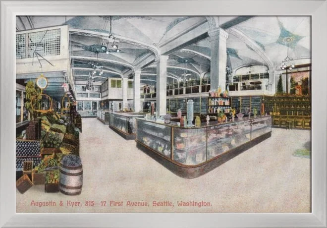 Augustine & Kyer was a grand, upscale grocery store with origins in Seattle’s early years. It was Seattle’s “Pure Food Purveyor,” selling food and merchandise of the highest quality. It also provided superior order and delivery service to its customers. Its stores flourished from 1907 until the 1930’s when, unfortunately, it succumbed to the Great Depression.