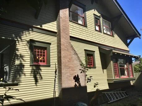 Built in 1907, this simple Craftsman bungalow is characteristic of a popular West Coast style that continues to spark local enthusiasm. The style is marked by a low profile with a ridge parallel to the street and wide overhanging eaves on bulky brackets. First story clapboard (called beveled siding in the west) cladding paired with shingles on the second story marks just about all bungalows. Large plate glass windows hidden under a porch that protects living spaces from the hot summer sun are another distinctive feature. Our house looms over the street on a low rise created for sure by the grading of the street early on.